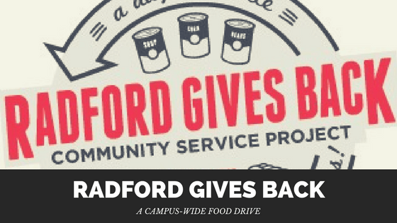 The second annual Radford Gives Back (RGB) community service project is a campus-wide food drive for Bobcat Backpacks Program, which is a local non-profit community that helps feed over 115 Radford City students, led by President Brian O. Hemphill and Dr. Marisela Hemphill.